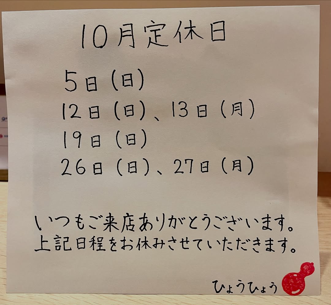 先のお知らせの通り、10月より定休日を変更させて頂きます。