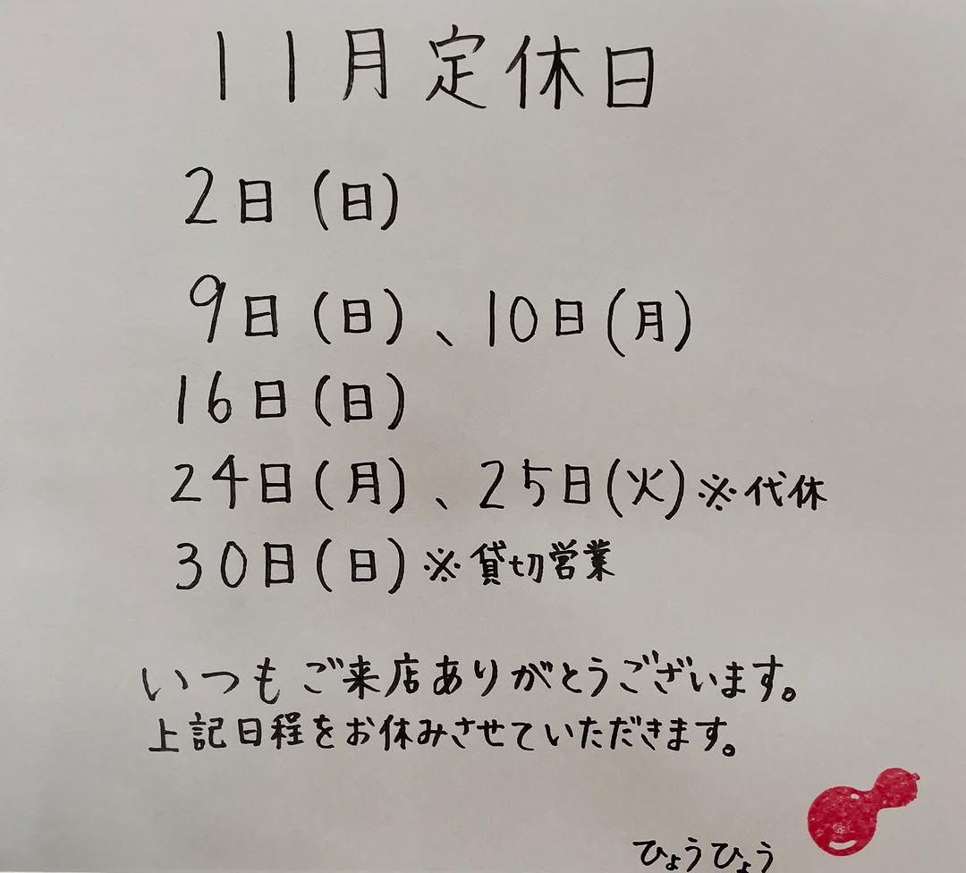 11月の定休日が決まりましたので、お知らせさせて頂きます🐖